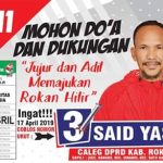 PSI, No Urut 3, Said Yasil Optimis Bukan Pesimis Nasional, Politik & Parlemen|16 Februari 201916 Februari 2019oleh Admin ROKANHILIR – Maju dan terpanggil dari hati nurani sebagai Bakal Calon Legislatif