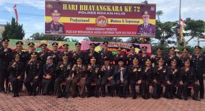 ROKANHILIR Jajaran Kepolisin Resor Rokan Hilir (Polres Rohil) menggelar upacara bersama seluruh jajaran Forum Komunikasi Pimpinan Daerah (Forkopimda) Kabupaten Rokan Hilir (Kab Rohil) dalam rangka memperingati HUT Bhayangkara ke- 72 di Halaman Mapolres Rohil, Rabu (11/7/18) pagi.