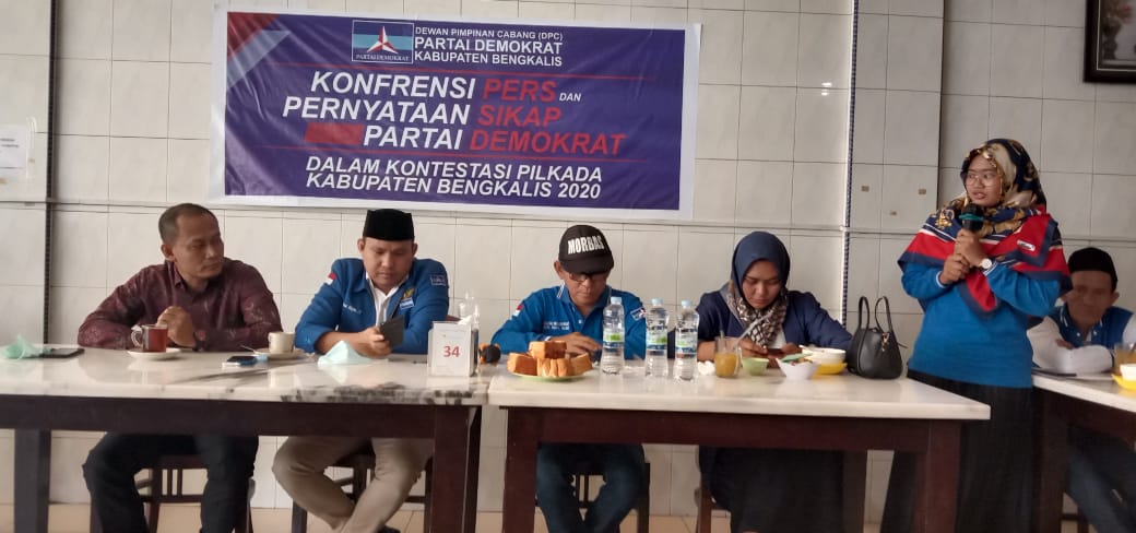 BENGKALIS – Pengurus Dewan Perwakilan Cabang berlambang Mercy, Partai Demokrat Kabupaten Bengkalis menggelar konferensi pers dan menyampaikan pernyataan sikap pasca Partai Keadilan Sejahtera (PKS) mendeklarasikan pasangan Abi Bahrun-Herman Ahmad sebagai bakal calon Bupati dan Wakil Bupati Bengkalis diusung PKS-PPP, Rabu (15/7/2020) di Kabupaten Bengkalis.