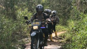 Untuk mengirimkan barang bantuan tersebut, personel Polres Lingga harus menggunakan sepeda motor trail karena akses jalan yang kurang layak.