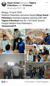 Foto tersebut dipublikasi di dalam postingan yang diunggah akun FB Dayan Antam pada pada 20 April 2020 di laman Facebook ‘Tagana Pekanbaru’. Para relawan berswafoto bersama dengan Kepala Dinas Sosial, Khairani, di dalam gedung yang berisi tumpukan Beras.